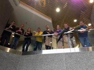 One of our team building activities was building balsa wood planes and trying to hit a box from our second floor atrium. Check out the pictures below… the prize for the person who got closest to the box was a LEGO airplane or $20. Chris, one of our leasing agents, won and he opted for the cash.