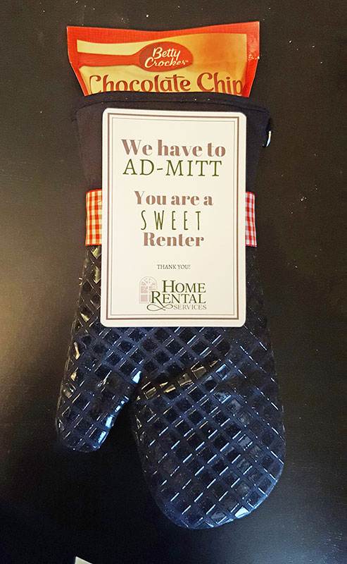 After several meetings to find the perfect gift, we decided on a nice oven mitt with a pack of cookie mix. The card read, “We have to ad-mit, you’re a sweet renter.”
