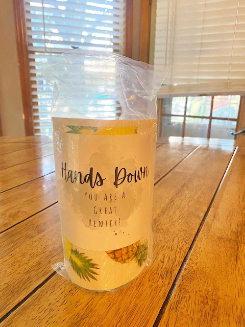 Amy is our very own renewal coordinator. She packages up the gifts for the renters so they look pretty. As part of the renewal process, she does a walkthrough of the house. She has told me she loves to hand the gift over to renters who meet her at the house. If they’re not there, she leaves the present for them to find when they come home.