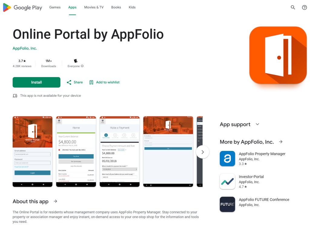 One of the resources we have to help renters keep their leasing life organized is the renter portal. Is there an app for that, Oretta? I am glad you asked because there is! Just search for AppFolio Online Portal app in the app store on your device. (Apple App Store version | Google Play Store version)